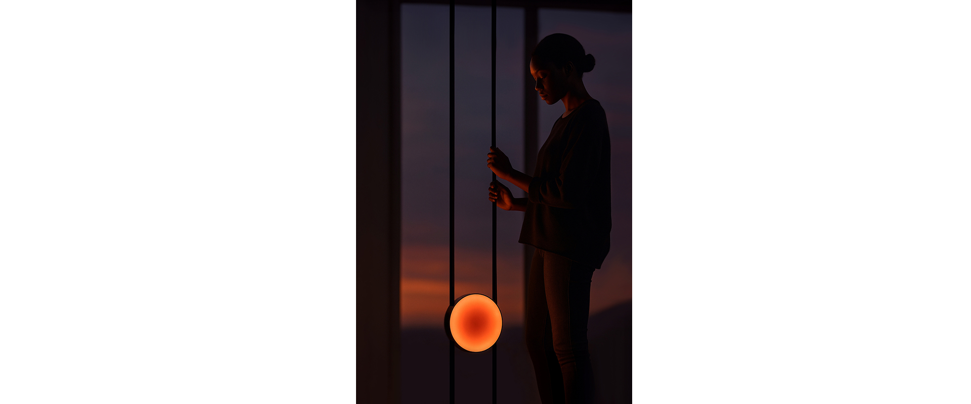 Su(n)spend ist eine interaktive Leuchte, die das Sonnenlicht in unsere Wohnräume bringt. Die Leuchte ist durch filigrane Gurte zwischen Boden und Decke gespannt. Durch Ziehen dieser Gurte, ähnlich wie beim Verstellen einer Jalousienschnur, steigt su(n)spend sanft zur Decke auf oder sinkt wieder herab. Während sich das Licht bewegt, durchläuft es ein Farbspektrum, das die Farbtöne der Sonne am Horizont widerspiegelt. Su(n)spend verändert ihr Licht graduell von einem hellen, klaren Weiß am höchsten Punkt bis hin zu warmen, dämmrigen Tönen wie bei Sonnenuntergang und bietet so ein taktiles und emotionales Erlebnis durch ihre dynamische Interpretation der Reise der Sonne am Himmel. Um ihr Leuchten nachhaltig zu versorgen, wird su(n)spend ganz bewusst vor einem Fenster platziert. Eine Solarzelle, die auf der Rückseite der Leuchte angebracht ist, sorgt für eine autarke Energiequelle durch die Sonne selbst. Die Lichtintensität nimmt mit Absenken Position ab, wodurch sich auch der Energieverbrauch reduziert. NutzerInnen können dadurch intuitiv auf den Ladezustand reagieren, das Licht dimmen und lernen, bewusster mit Energie umzugehen. Su(n)spend greift die Semantik der Sonne konsequent auf – formell, interaktiv, technisch und poetisch. Die endlose Schlaufe des Bandes ist eine symbolische Darstellung des kontinuierlichen Sonnenzyklus und schafft eine fesselnde und persönliche Interaktion mit dem Sonnenlicht und seiner tiefgreifenden Verbindung zu unserem Leben.